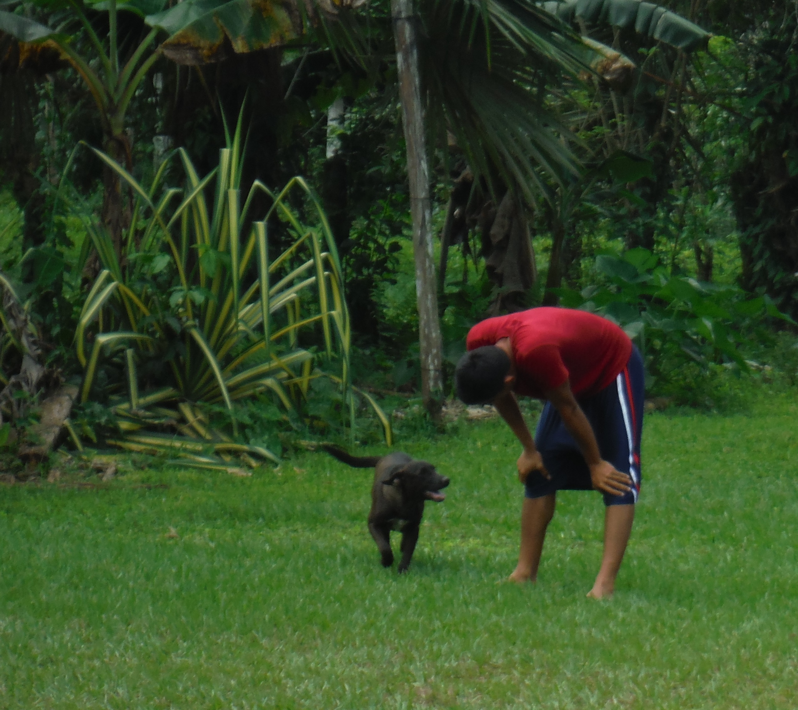 Jackeline (edad 11, la hermana biológica de Josue), intentando atacarme mientras que la estaba mojando con la manguera. Logró su meta poco después de tomar la foto!
